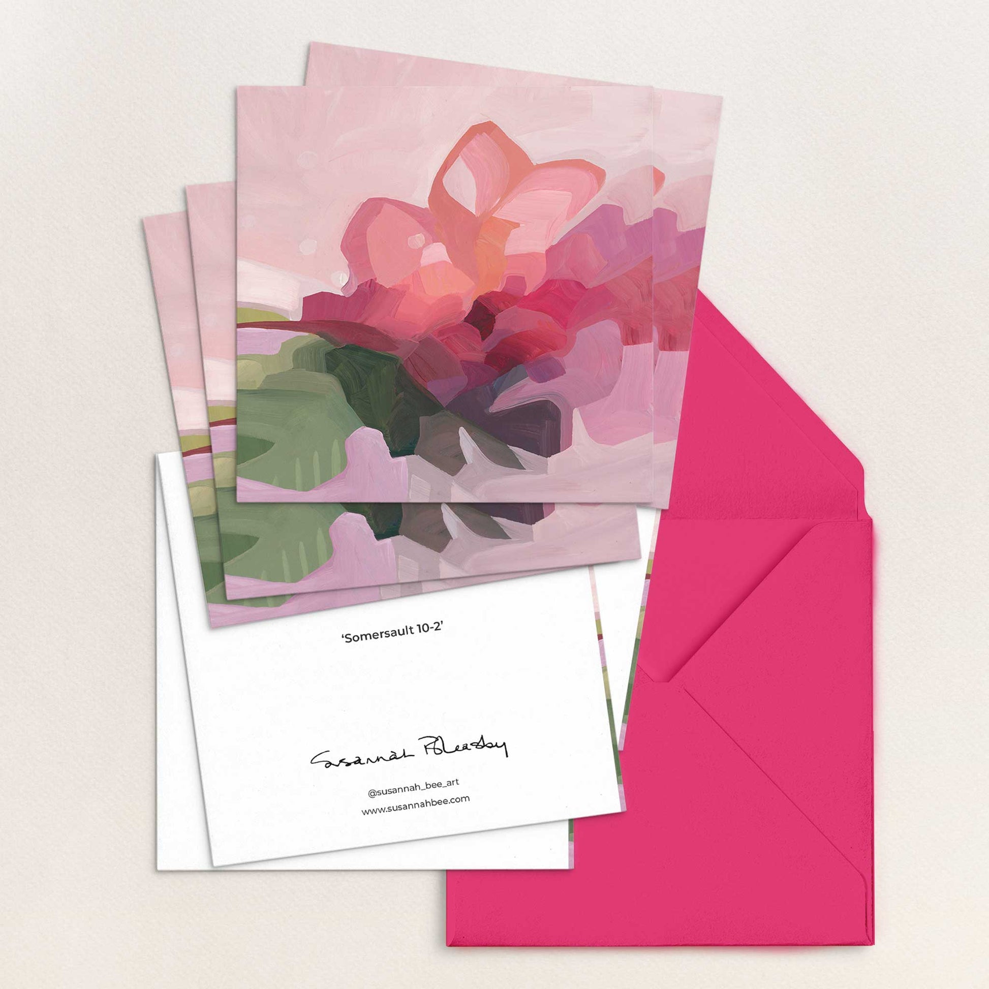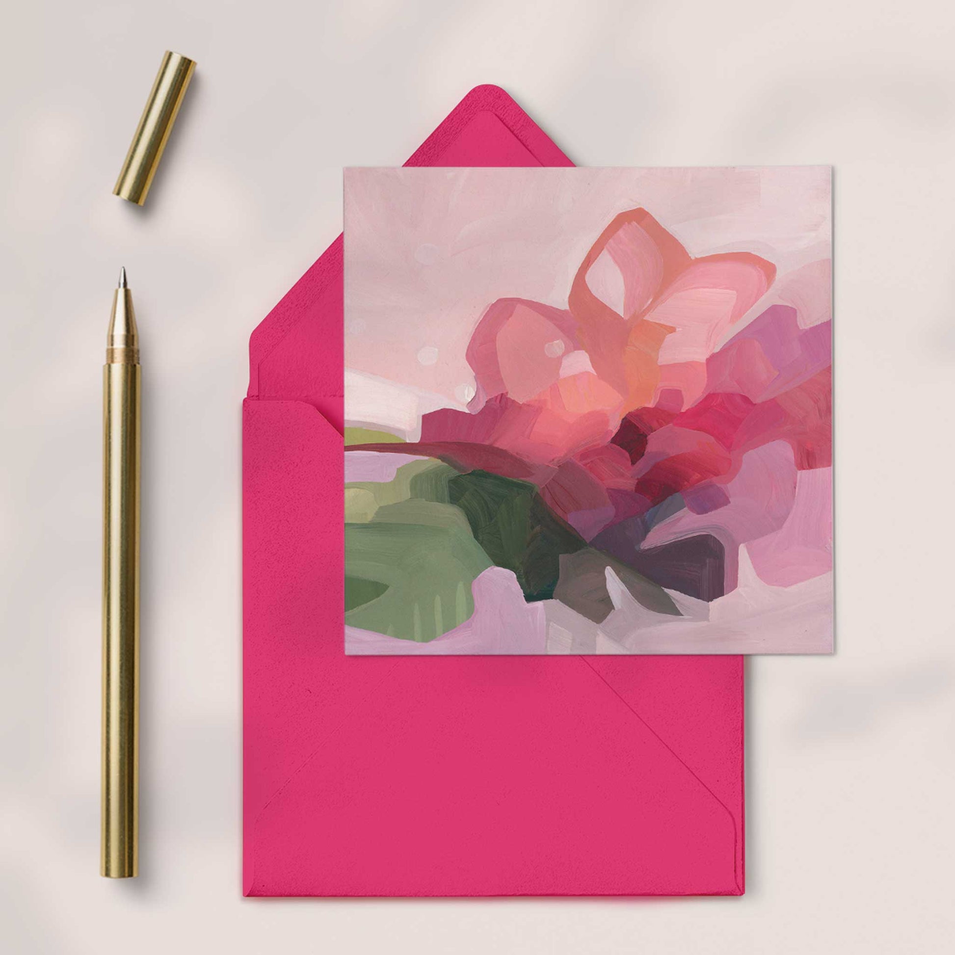 Like a vase of fresh-cut flowers, a floral art card will brighten someone's day and remind them to stop and smell the roses. The pink, peach, and magenta bouquet offers a wonderful abstraction, with petal and leaf shapes blending beautifully in vibrant, perfectly imperfect brushstrokes, capturing the fleeting beauty of springtime blooms.