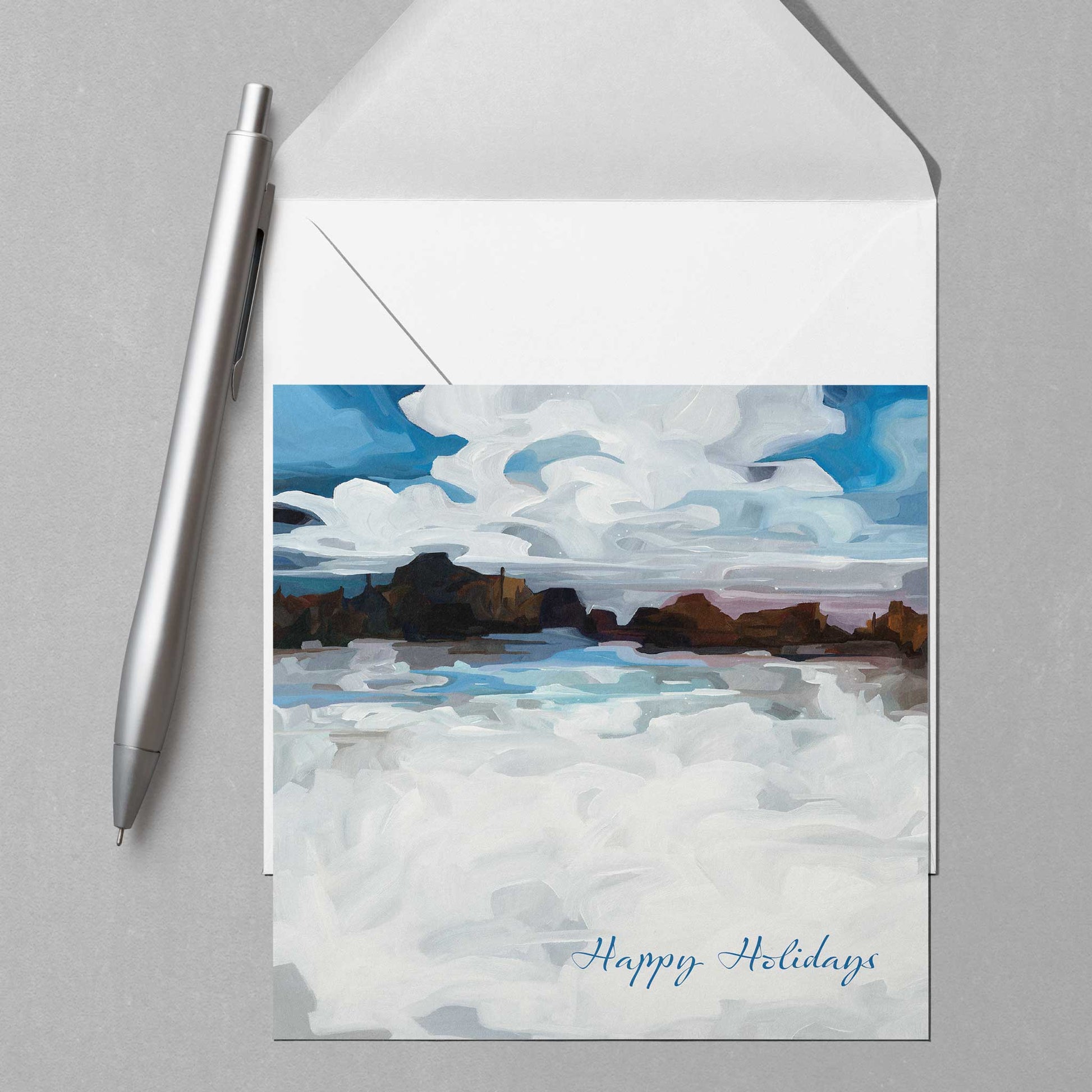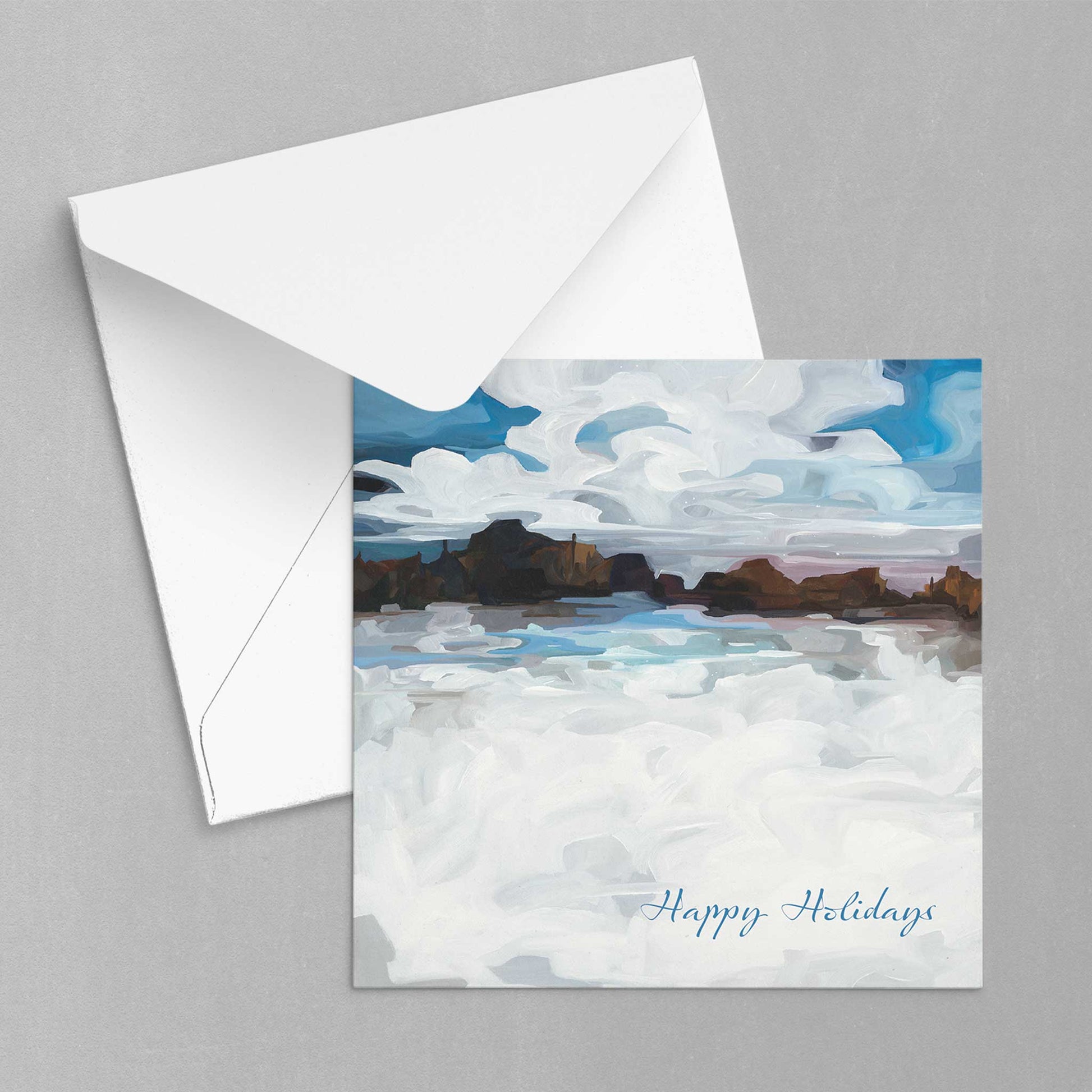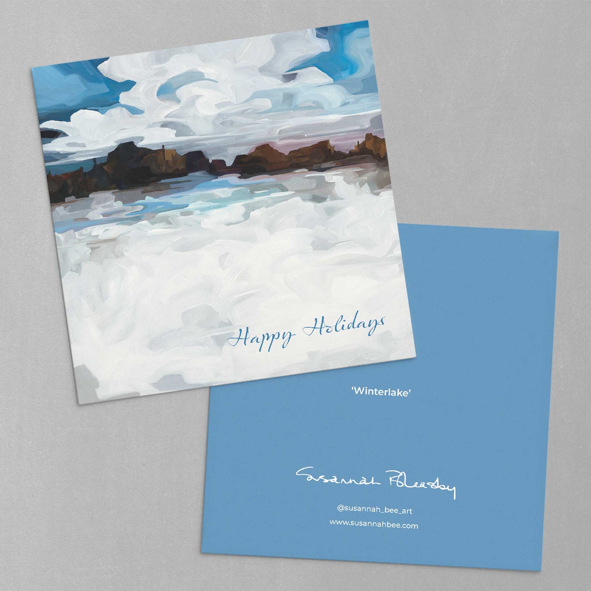 Imagine a beautiful clear blue sky and the sparkle of winter sun reflecting on a fresh blanket of snow. The fine art holiday card ‘Winterlake,’ inspired by the solitude of a winter hike, evokes the feeling of crisp, cold air and the comfort of a hot drink upon returning home.