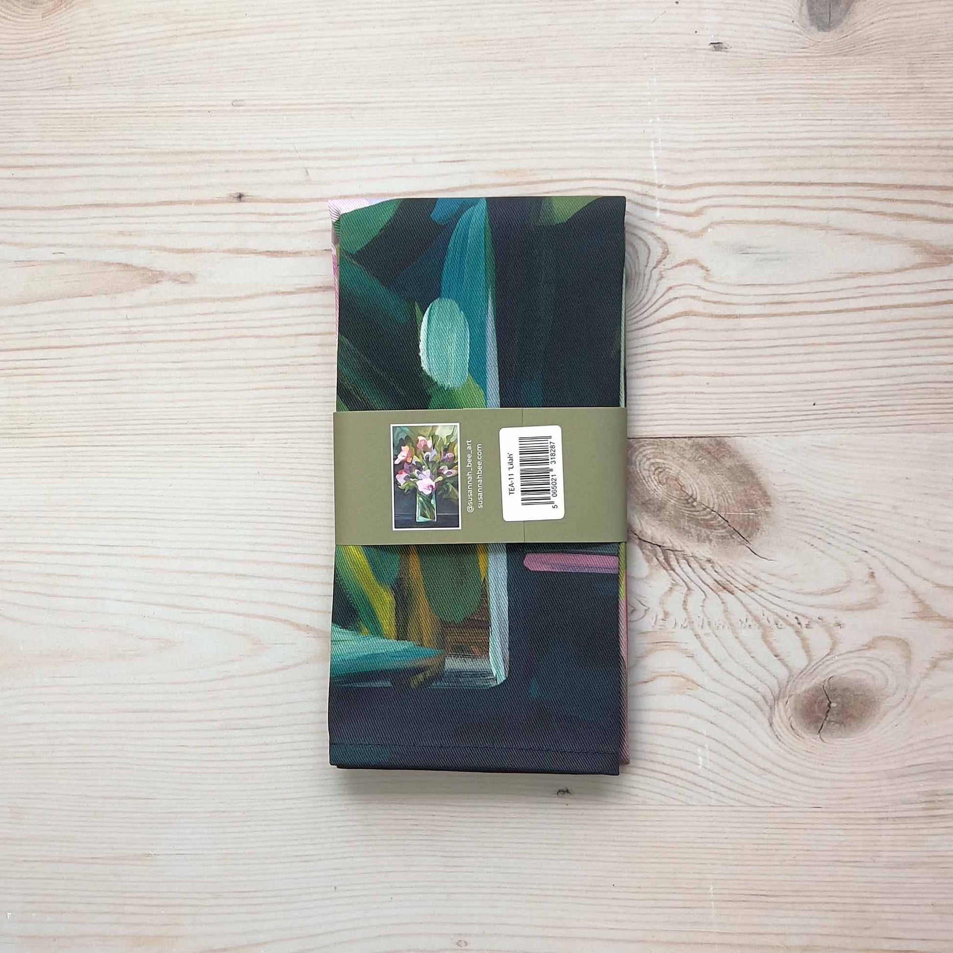 Cotton tea towel with a floral bouquet painted in a rich colour palette of purple and greens. Created from an original flower painting with bold blooms and flowing brushstrokes, it brings both beauty and function to everyday use. Each tea towel is folded with a printed belly band showing the full design, making it perfect for gifting or display.