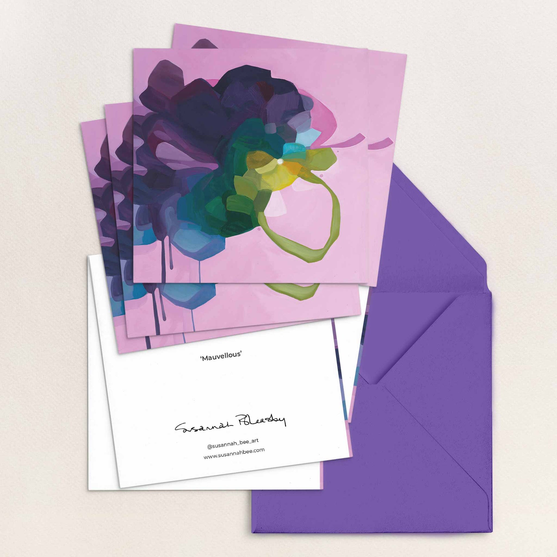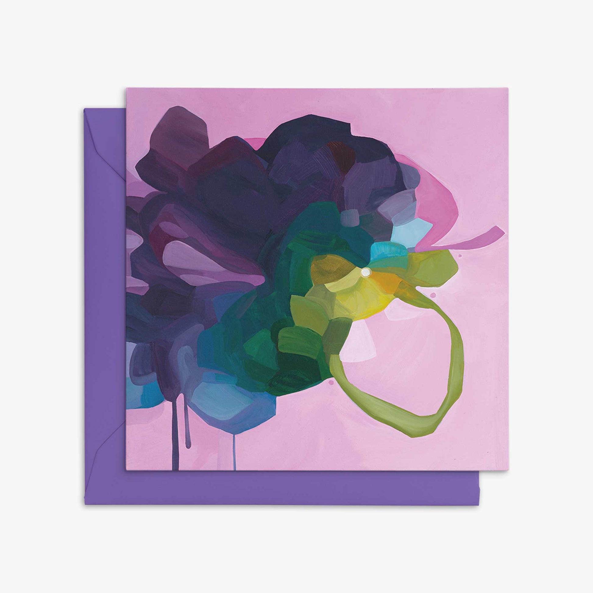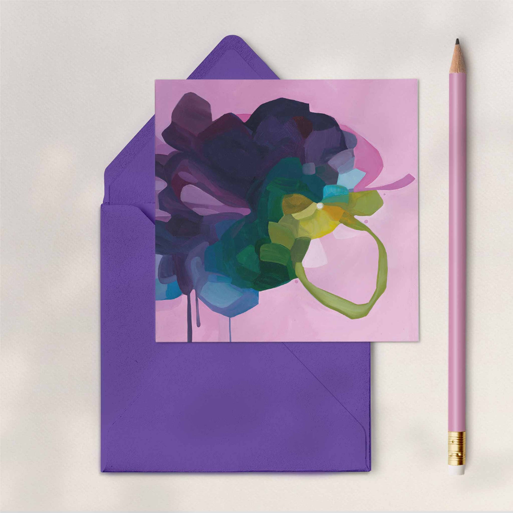 An art card showcasing an abstract painting that blends the joyful energy of pink with the majestic depth of purple to inspire creativity and wonder. With a personal message inside it easily becomes a unique artistic greeting suitable for birthdays, anniversaries or to simply say hello.