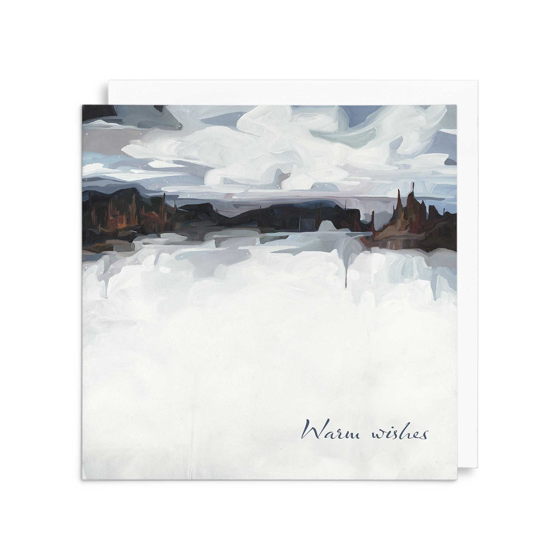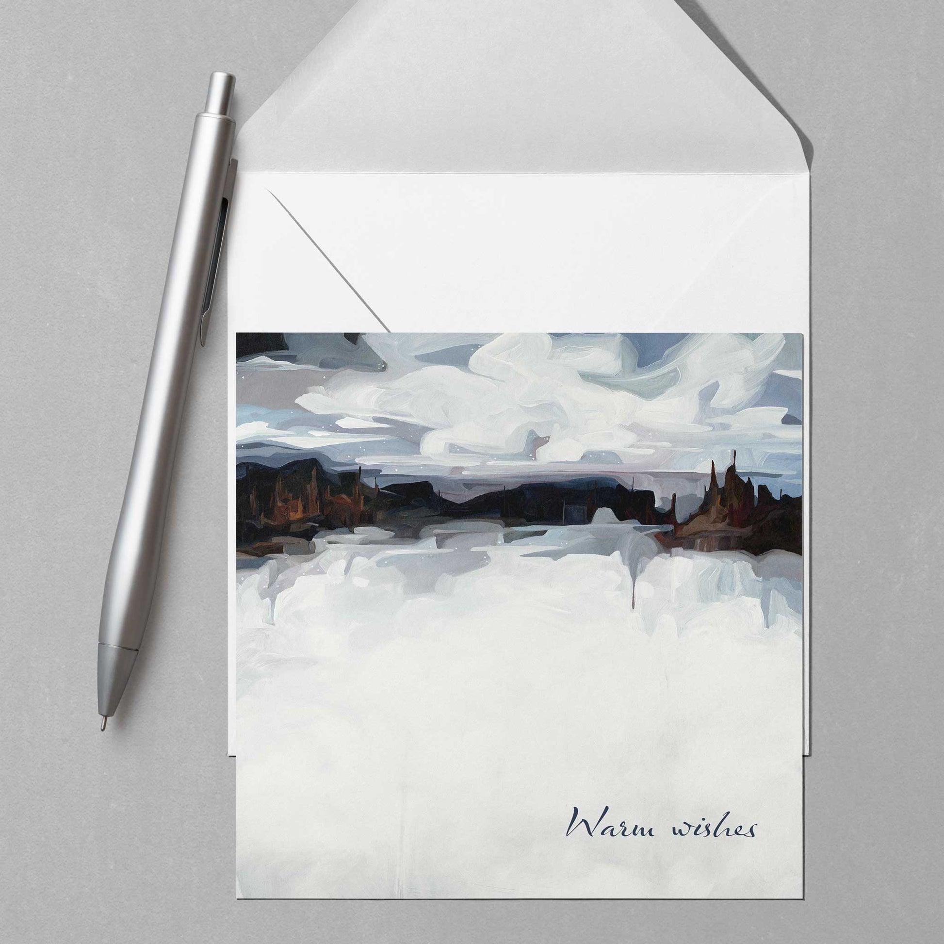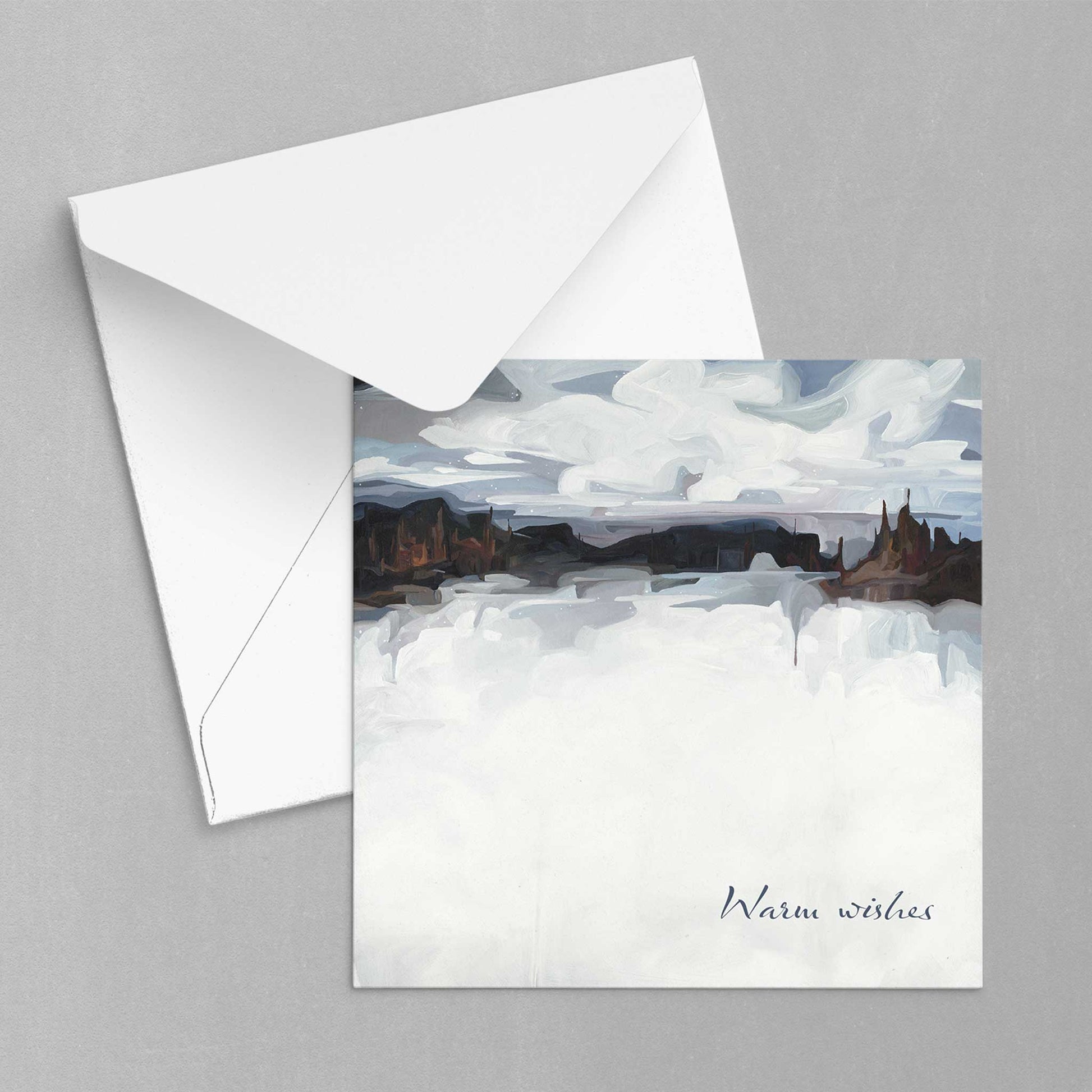 Celebrate the warmer side of the winter holidays this season. The winter view on this Christmas Card reflects the profound quiet of an evening snowfall and the solitude that comes when you’re the only one stomping around in the midst of it.