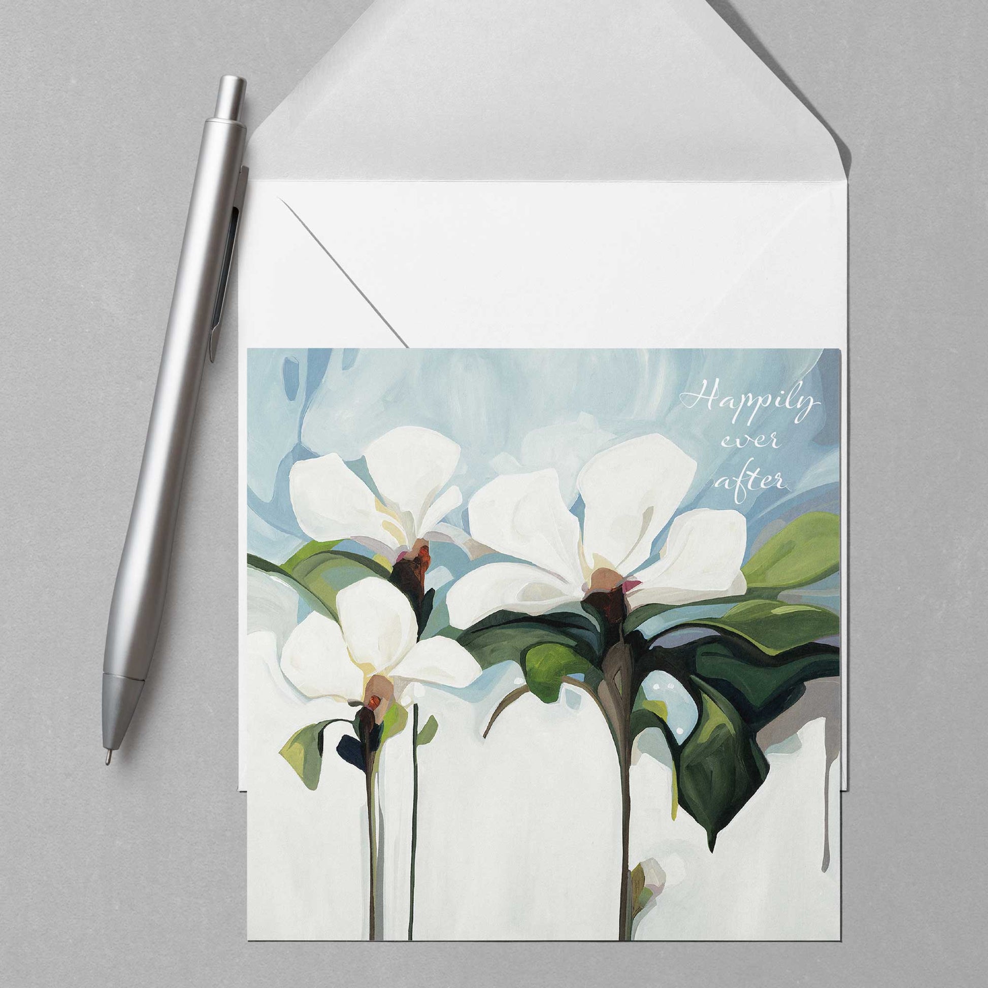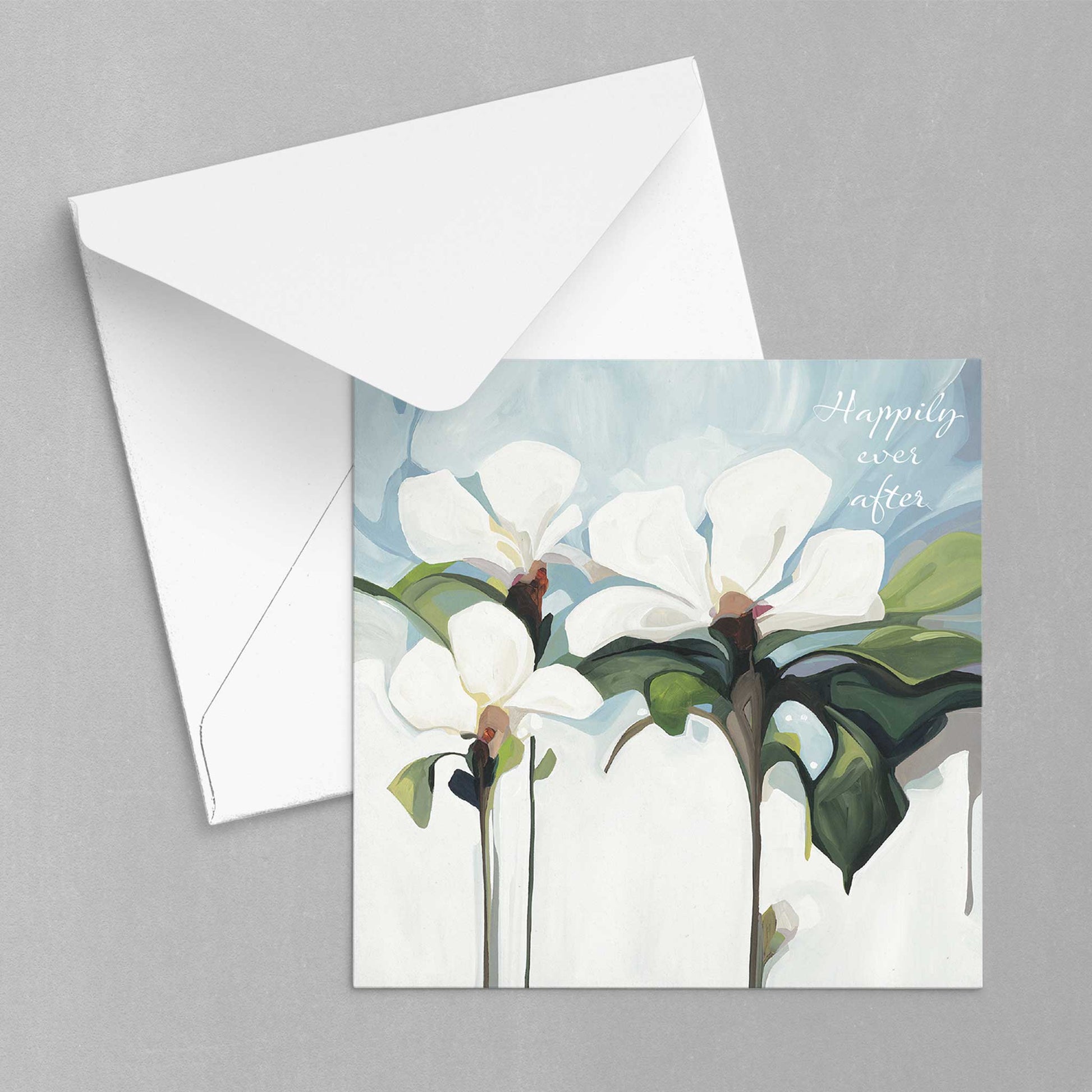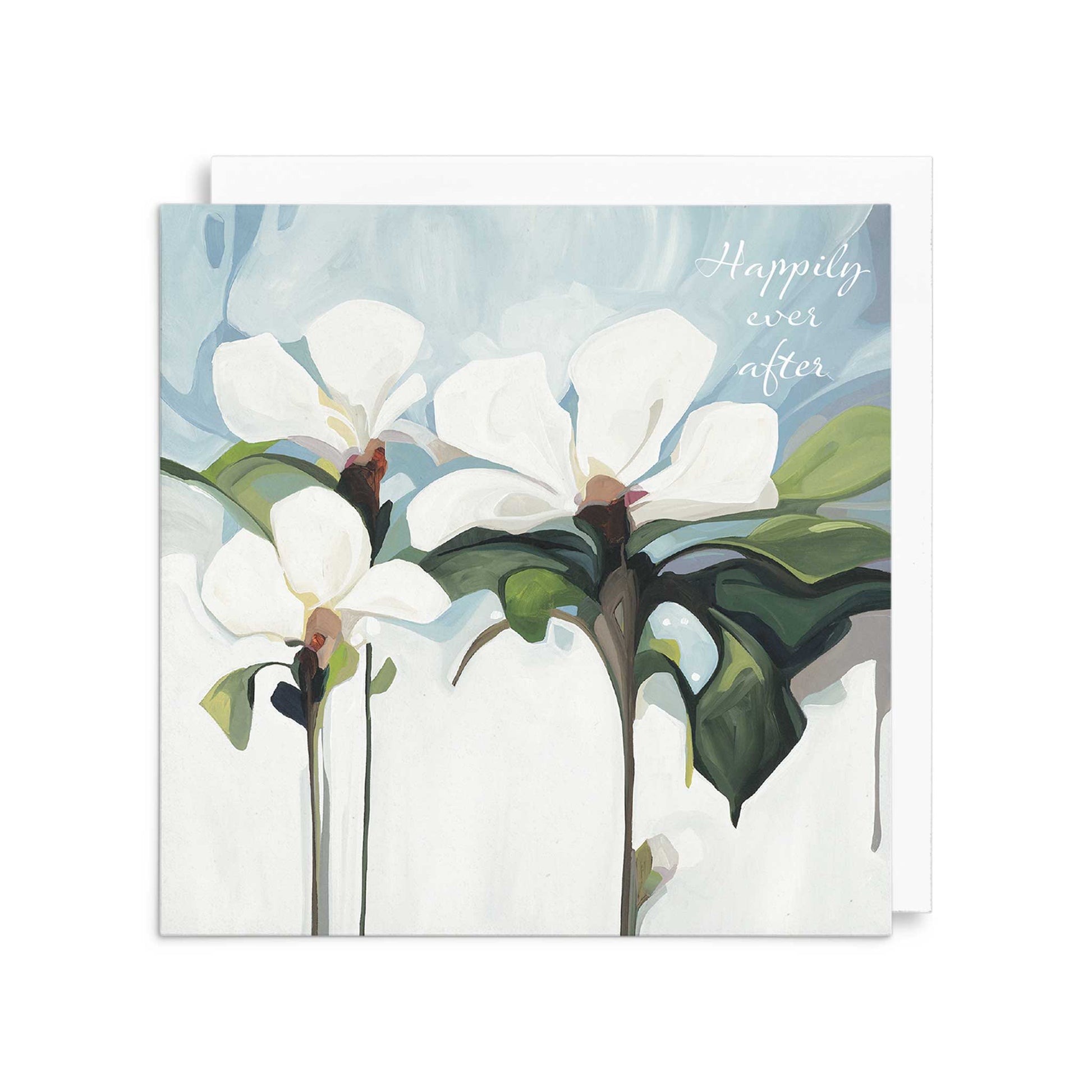 Weddings are magical days to celebrate love and congratulate a happy couple tying the knot. They are also moments to make amazing memories. Elegant white flowers grace the front of this floral wedding card with the joyful message 'Happily ever after.' Inside it’s blank for the sender to add their personal wedding wishes and celebration message.