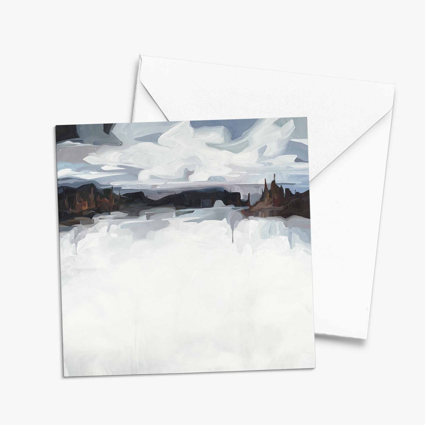 A winter view that reflects the profound quiet of an evening snowfall and the solitude that comes when you’re the only one stomping around in the midst of it. This winter wonderland art card is the perfect backdrop for a Christmas letter, and when combined with a handwritten message tucked inside, it becomes a treasured keepsake for a special someone.